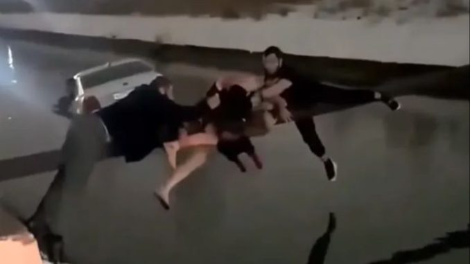 Prema snimku, jedan od muškaraca prešao je preko grede dok se automobil približavao. U tom trenutku drugi muškarac, obučen samo u donji veš, polako se spustio niz gredu kako bi pomogao. Treći muškarac držao je dječaka za noge dok ga kolega prebacio na sigurno.